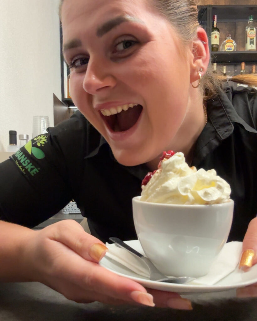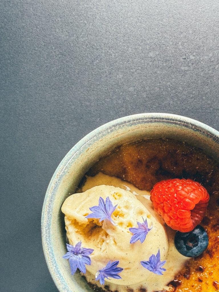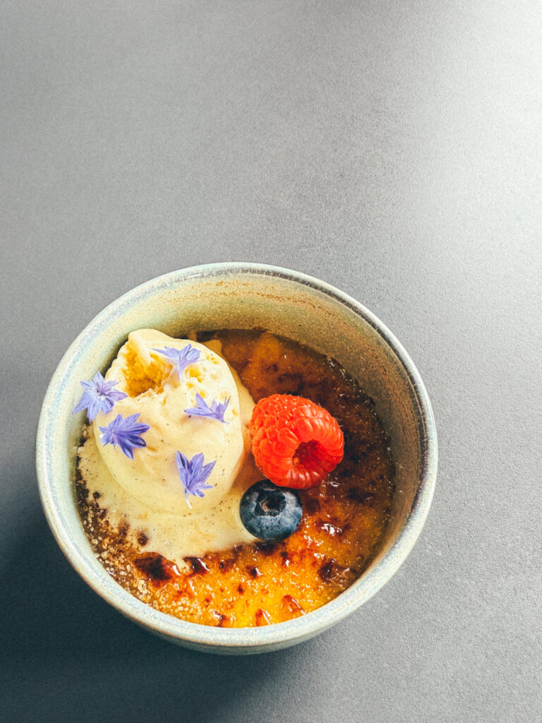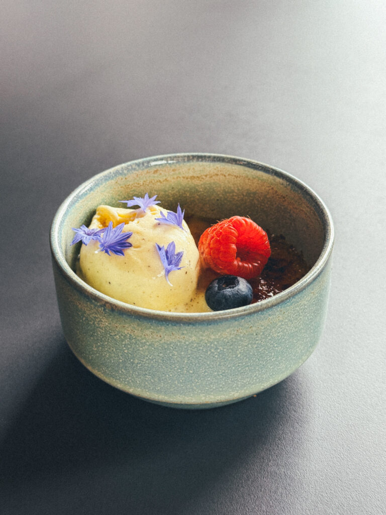 Sladkou bodkou je tekvicový crème catalane s vanilkovou zmrzlinou a bobuľovým ovocím, jemný, hrejivý a sladko korenistý dezert, ktorý uzatvára jesenný gastronomický príbeh.