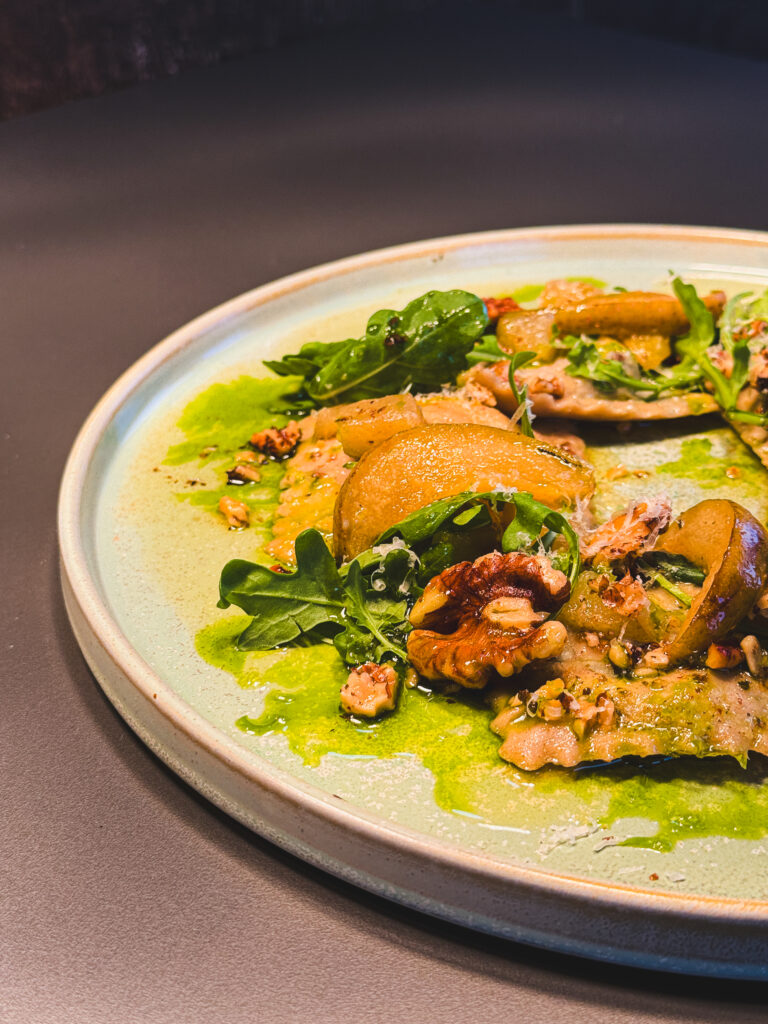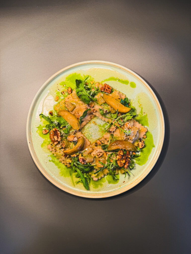 Alternatívou je vegetariánsky chod – domáce pohánkové ravioli so syrom s modrou plesňou, karamelizovanými hruškami a restovanými orechmi. Pohánka, ktorá je prirodzene spojená s regiónom Pohanského, tu zohráva hlavnú úlohu. V kombinácii s výrazným syrom a sladkými hruškami vzniká jedlo, ktoré je plnohodnotné, vyvážené a chuťovo bohaté.