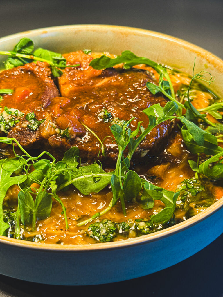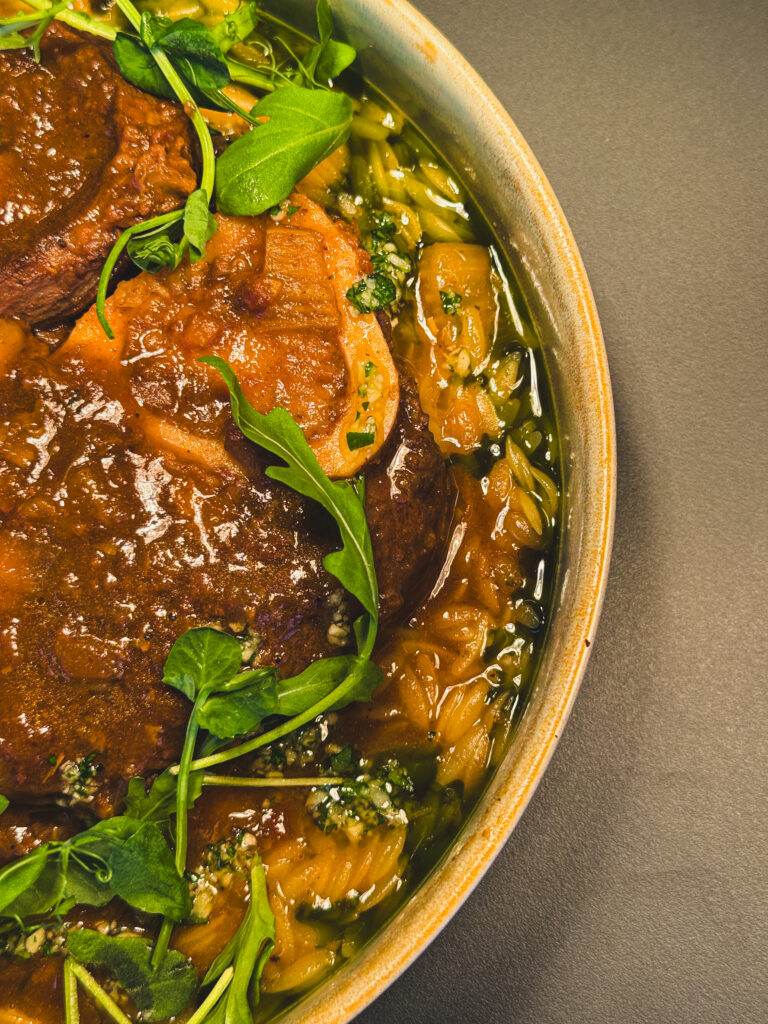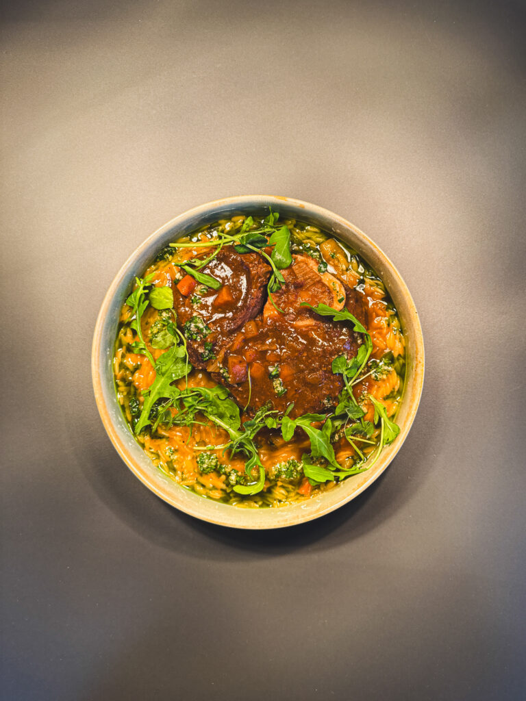 V zime má čas v kuchyni úplne iný význam. Práve preto je súčasťou menu pomaly dusené teľacie ossobuco na bielom víne. Dlhá príprava umožňuje mäsu zmäknúť a rozvinúť plnú chuť, ktorú dopĺňa svieža gremolata a krémové orzo.